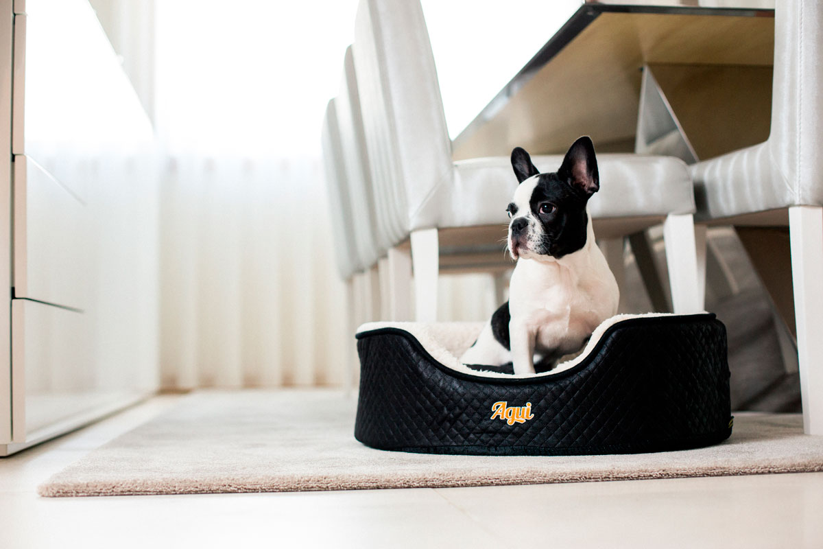 Cama oval revestida a pele preta sintética costurada em padrão diamante em contraste com o revestimento interior em lã sintética.