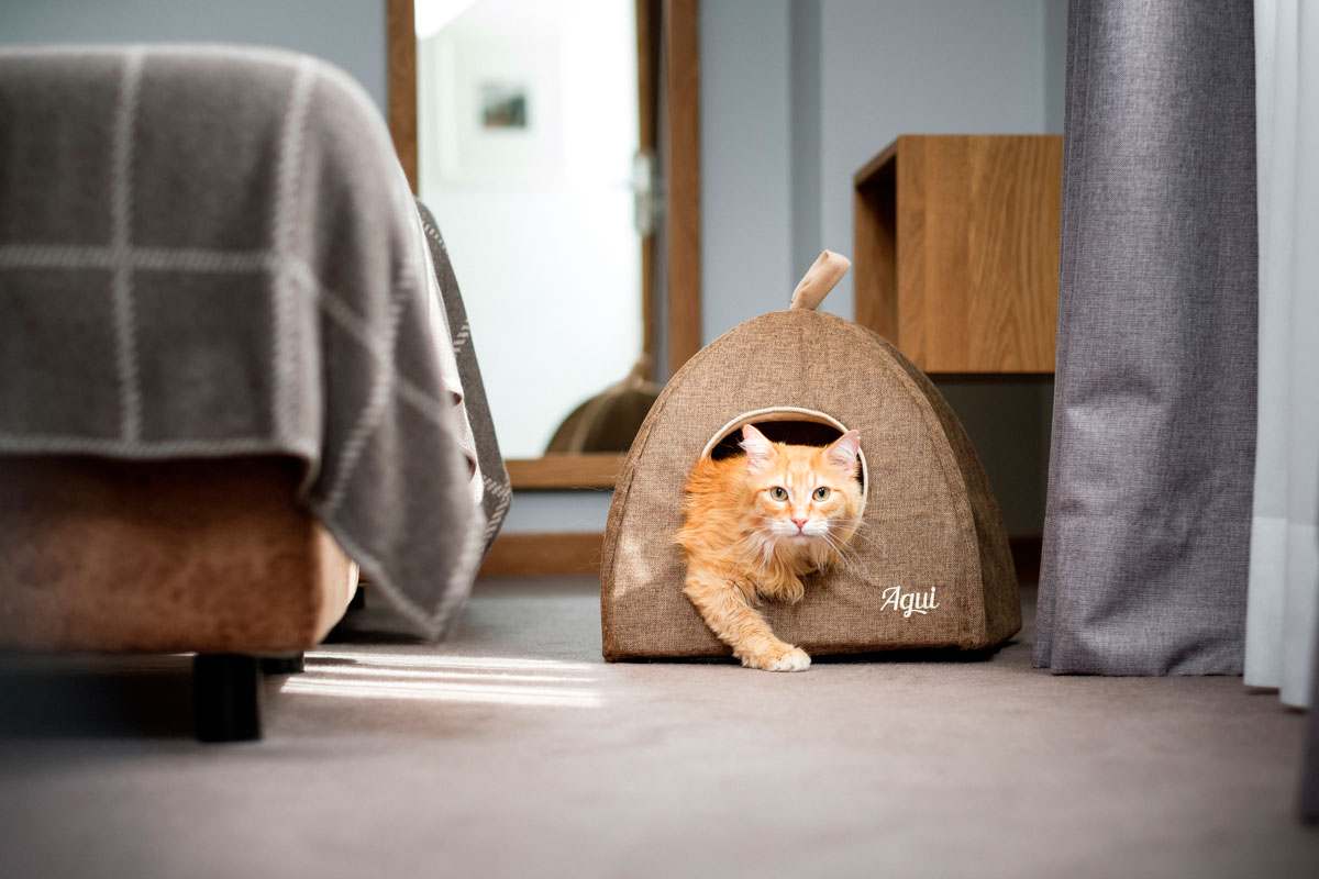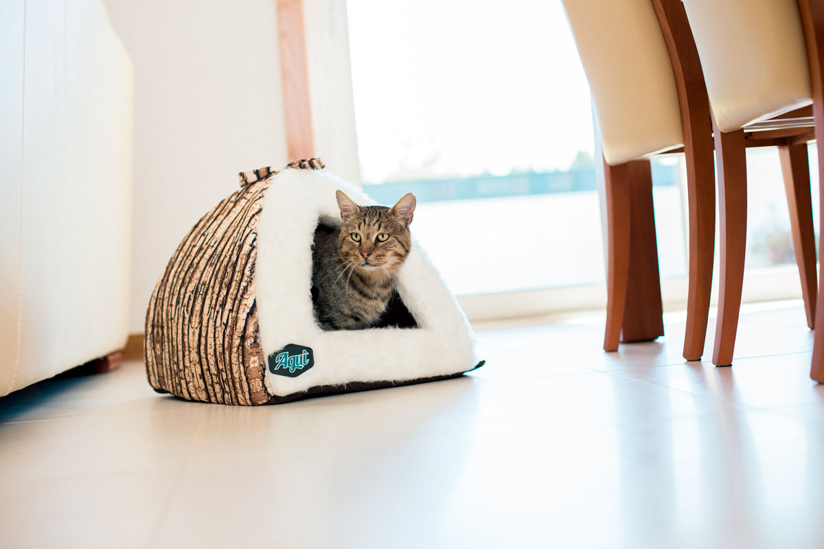 Iglo revestido a tecido preto em contraste com o revestimento interior e a face em pêlo cinzento macio.