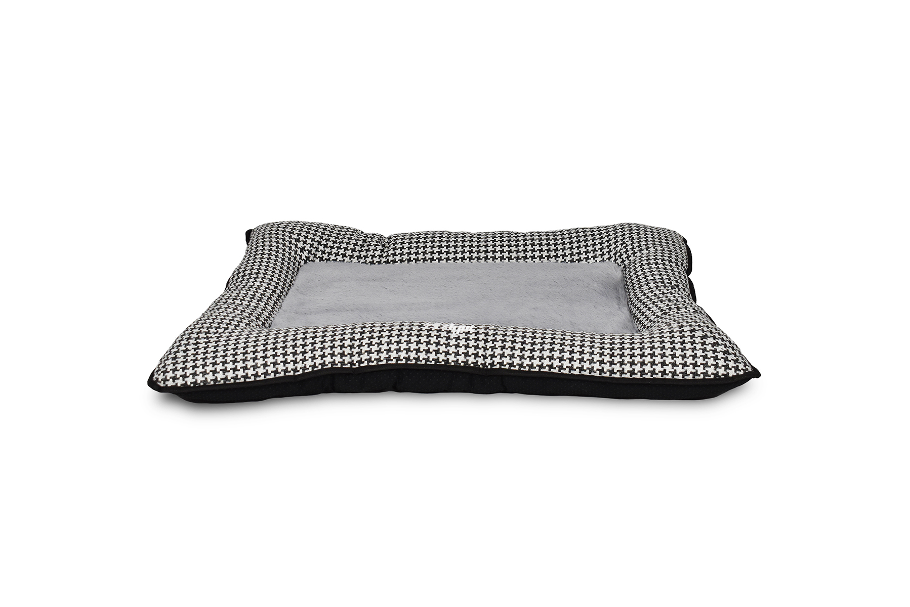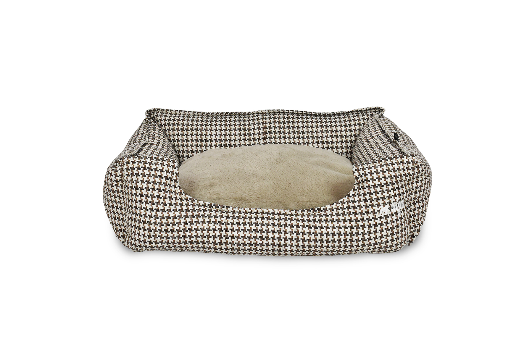 Puff produzido em tecido e pêlo, com logotipo bordado. Capa amovível para lavagem. Enchimento em fibra reciclada.